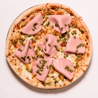 Соус томатный, моцарелла, подкопченная куриная грудка, огурчики маринованные, шампиньоны, бекон, болгарский перец