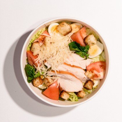 Лист салата, томаты, пармезан, семга, перепелиные яйца, сухарики